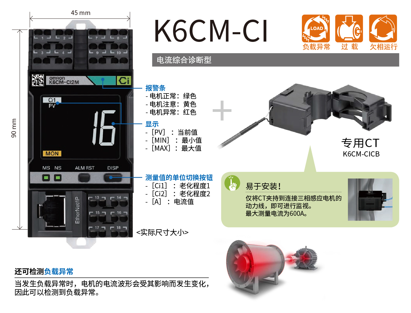 K6CM的电流综合诊断型是将CT和本体安装在控制柜内,根据电流来监测电机的状态,代替熟练技术人员进行频率分析等复杂的分析,实时监视电机的老化情况。