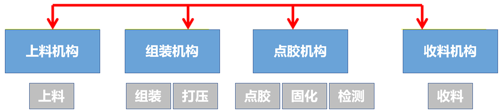 这个工艺主要由进料、组装、点胶,视觉检测和收料部分组成。
