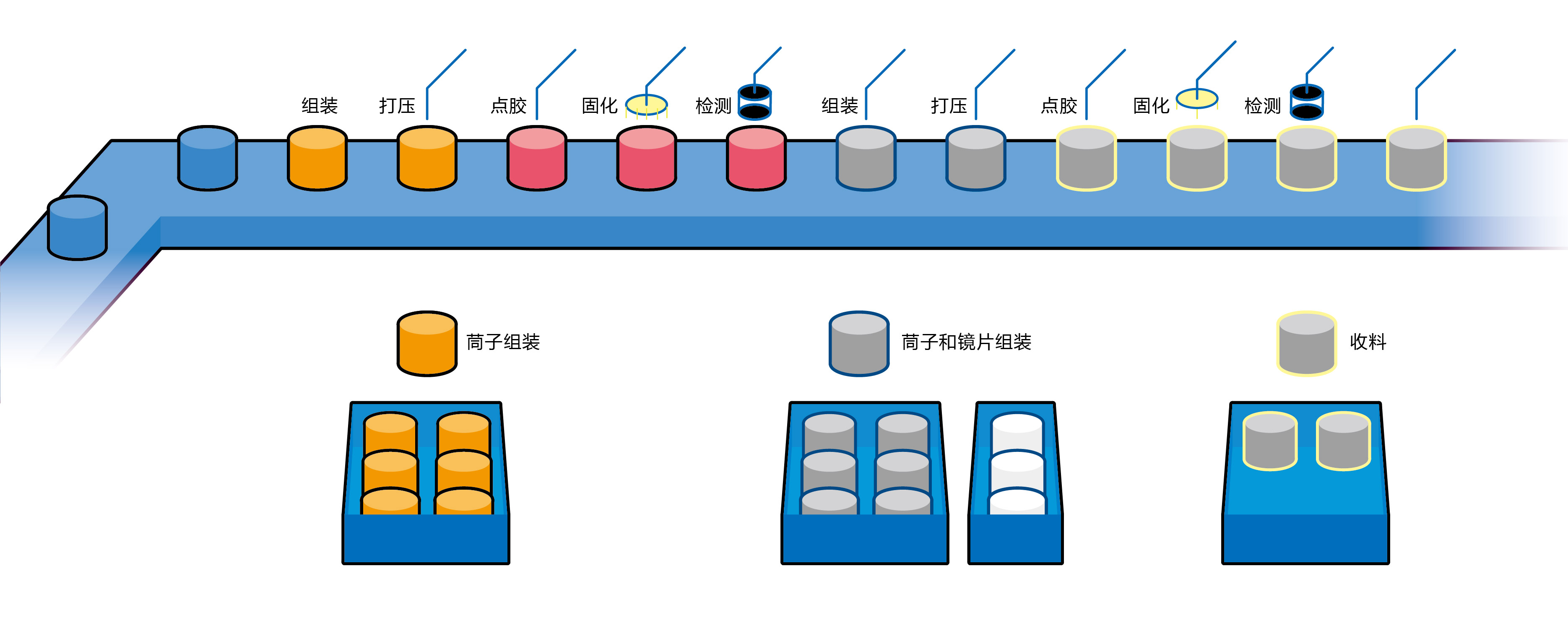 在镜头的生产环节如组装、点胶、固化和检测四大环节中可以灵活组合,大大提高了产线的灵活性和高效性。