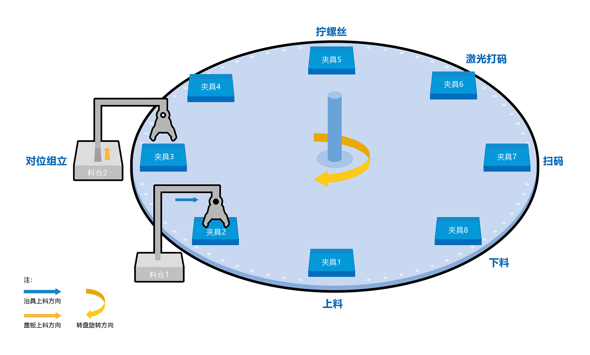 工件从上料工位送至转盘,依次通过对位组立、螺丝紧固、激光打码、自动扫码、下料五个工位循环加工。每个工位在启动之前会判断工位对应的工件有无和工件状态才决定是否启动。