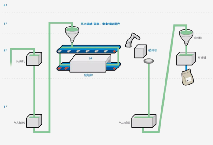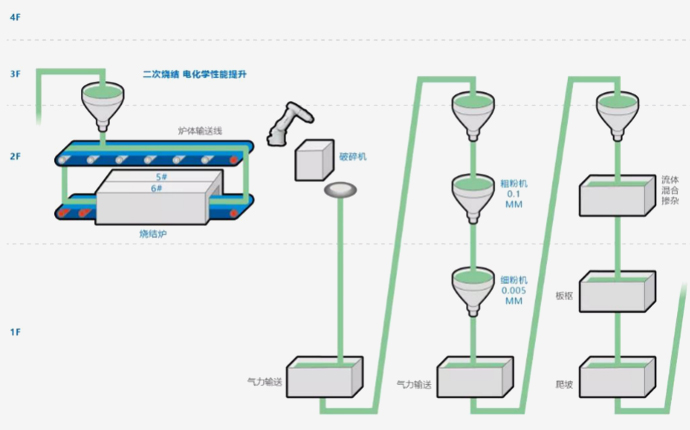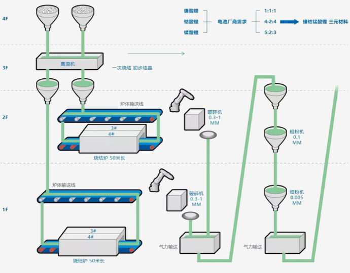锂电池正极材料智能工厂,全厂采用全自动生产模式,原材料镍酸锂、钴酸锂和锰酸锂按照一定的比例进行搅拌均匀,定量装入陶瓷匣砵内,通过输送带送达窑炉进行高温烧结,分别进行三次烧结和相应的破碎和研磨粉碎,最后生产出三元锂电池正极材料粉末,设备之间采用输送线、管道、气力输送设备和爬坡设备进行衔接。全厂总共10条生产线,如下是一条生产线的工艺图: