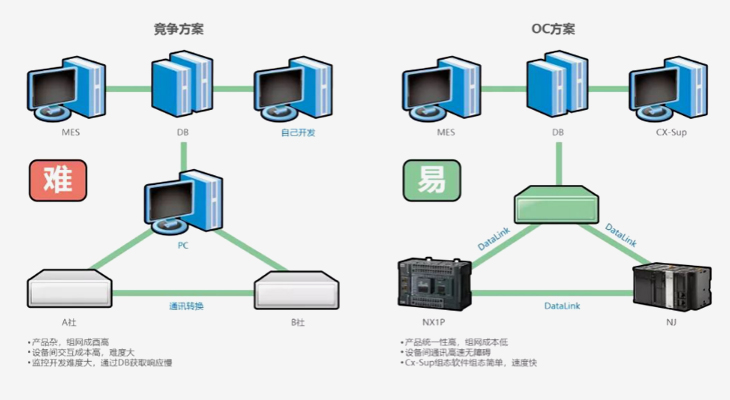 1)在方案制定上,组网采用主从PLC的方式,采用 NJDB进行数据的收集,可直接与MES数据库对接,采用 CX-Supervisor组态软件进行全厂设备的综合监控 ,设备与设备之间、设备与主PLC之间全部采用标签数据链接的方式进行数交互,控制方案如图5所示: