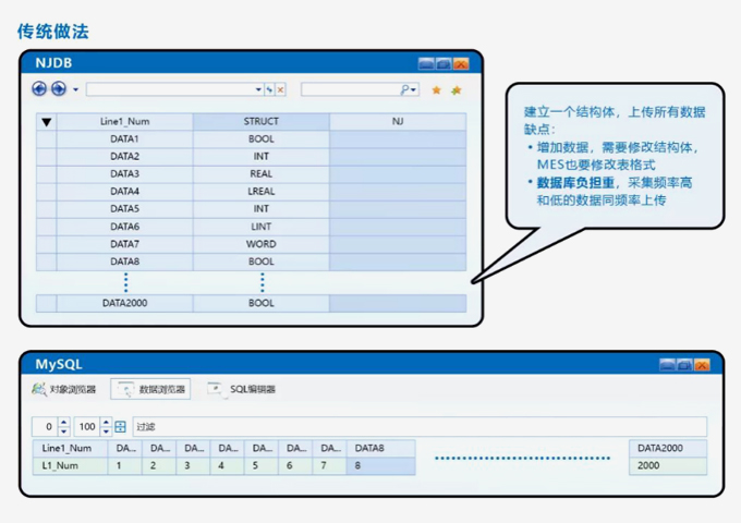 3)主PLC与MES交互,NJDB上传数据库的两种方式对比,对于上传数据库和下发数据可以通过建立一个结构体上传最多1024个数据,建立多个结构体,多通道上传,优点是可以同时上传很多数据,保证数据上传和下发速度,缺点是格式固定,增加数据比较繁琐,对于MES解析比较麻烦。