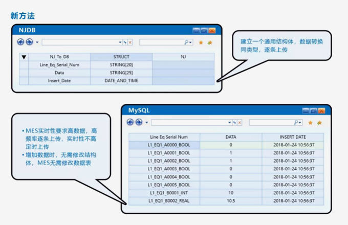 数据统一循环上传,主PLC接收所有设备数据后,将数据转换为统一数据类型,将数据顺序放入数组内,NJDB循环Insert和Update数据。根据MES要求对数据进行分级,多循环上传,实时性要求高的数据,采用多通道循环高速上传,等级低的定时循环上传,保证数据时效性的同时,在增加数据时非常方便。MES解析数据也非常方便,对于大量数据的控制系统这种方法能非常方便地实现与数据库的交互。