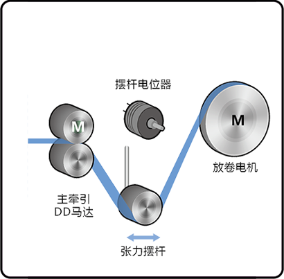 ■ 放卷区为异步电机加闭环变频器的配置;变频器采用模拟量控制;张力摆杆采用气缸产生张力,配备张力计监控;摆杆位置通过电位计进行反馈。