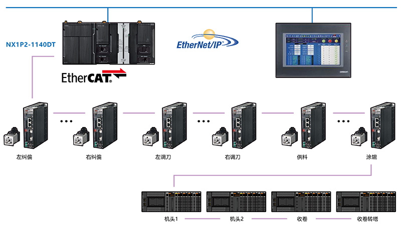 控制器采用集高功能运动控制和实现现场IoT网络于一体的NX1P系列,带动伺服电机分别控制左纠偏、右纠偏、左调刀、右调刀、供料与涂辊等。