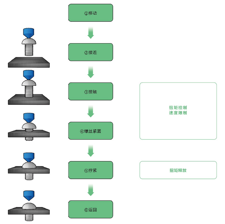 螺丝拧紧,一般主要通过设置在规定时间内是否达到预设值的扭矩,如果没有达到的话则提示/报错(滑牙)。