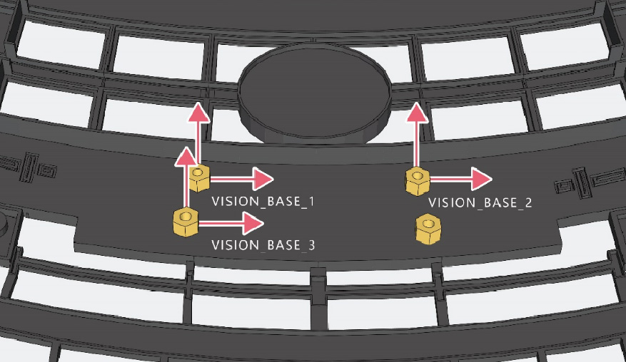 使用星空(中国)一站式服务官网TM协作机器人独特的三点视觉定位技术,在保险杠的局部,寻找一个相对固定且有清晰图标的平面,作为建立坐标系的标记点;再通过其自带的500万像素相机,对该标记点进行拍照定位;最终创建3个Vision Base坐标点,即通过3个坐标点确立一个基准面。(如上图所示)