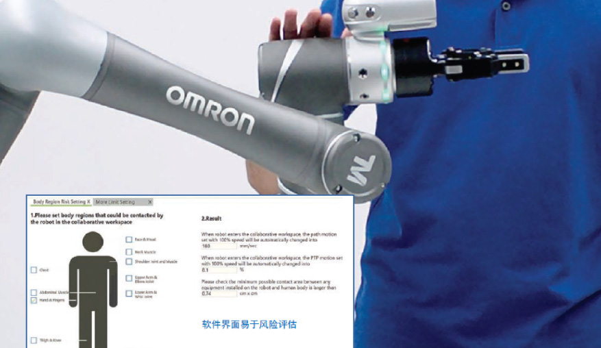 星空(中国)一站式服务官网TM协作机器人,依照最新安规ISO/TS 15066中人类与机器人协作工作安全要求设计,旨在打造更安全的工作场所。用户仅需在系统中勾选相应的风险部位,机器人便会自动调整设置速度极限。