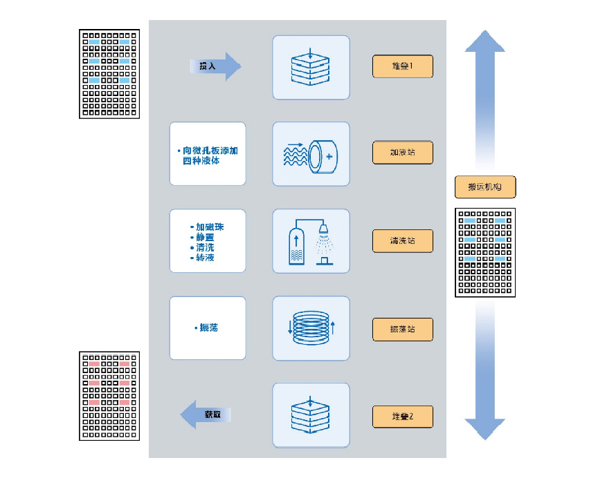 这类的核酸检测仪,称之为高通量核酸提取系统,即单次可同时完成几十甚至上百个样品的处理;并且整个搬运、取放流程无需人员介入,完全由机器人自主完成。