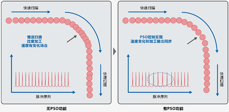 通过采集实时的编码器反馈进行位置比较,与激光器同步输出信号进行相位同步,在运动轨迹的所有阶段以恒定的空间(而非时间)间隔触发发射激光,解决了激光在加速、减速和转角段打出不均匀。