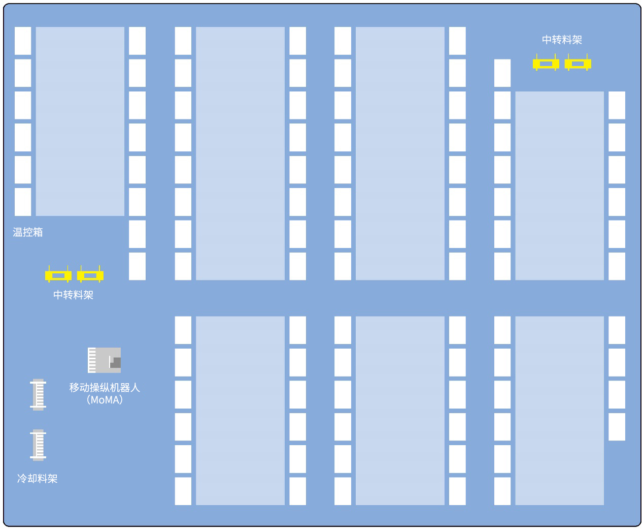 在高达80°的温控箱中将测试完毕的电池取出,累计至50块电池后再将其搬运到冷却料架进行自然冷却,冷却完毕后再搬运到中转料架让其进行其他工艺的测试,最终再将产品从中转料架搬运回温控箱继续高温测试。