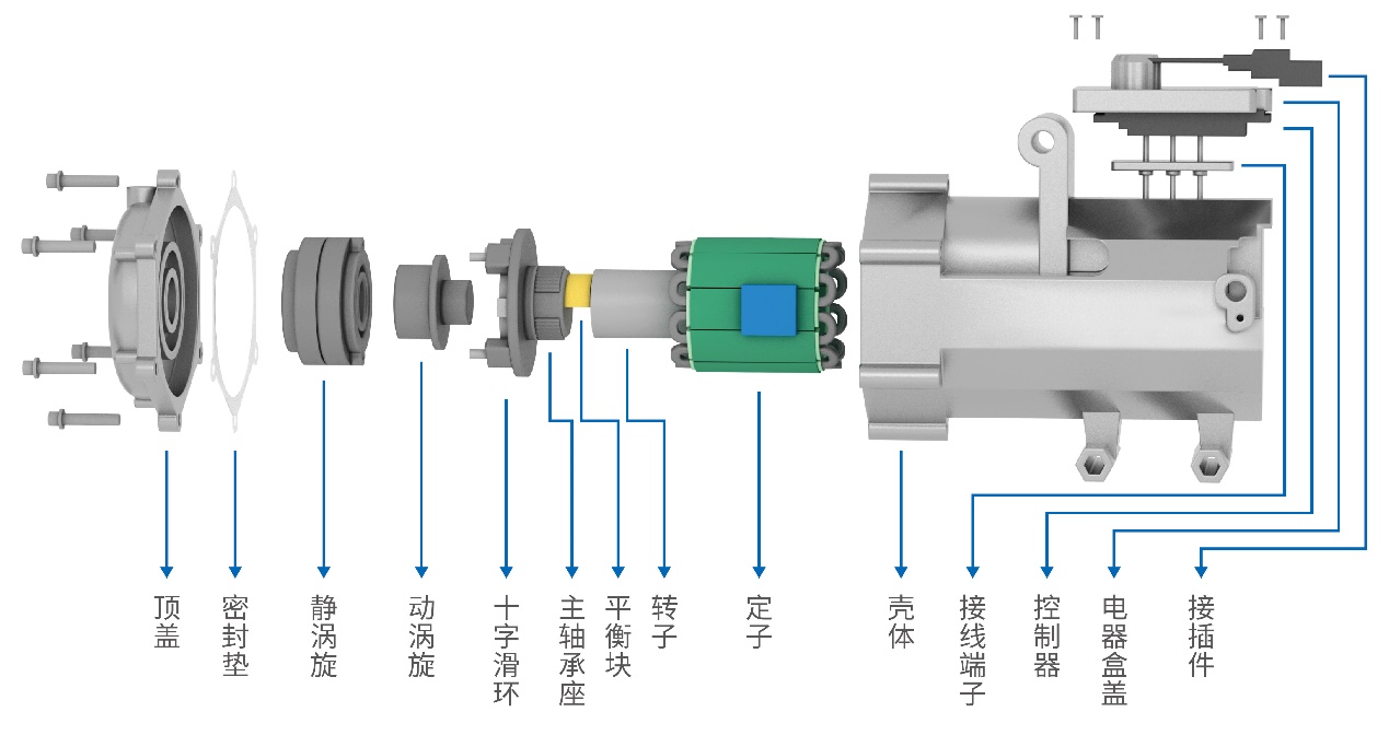 压缩机构:平衡块、轴承、动涡盘、静涡盘等关键结构部件;
