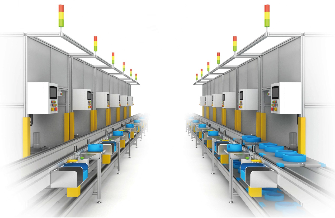 整条电动压缩机装配线由30-40套设备组线生产,每套设备独立控制联网生产,后台服务器下达订单指令时,触摸屏一键换型,每套设备都可以实现信息的高速同步;