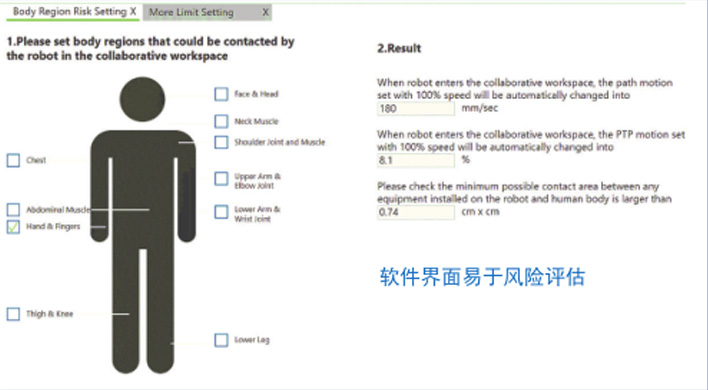 用户仅需在系统中勾选相应的风险部位,机器人便会自动调整设置速度极限,如此简单的安全设置省去了用户仔细研读机器人安全性能的各项参数和安全国标相关知识。